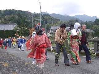 | 大木場集落を行く奇祭行列 大浦町でも、大木場は他の集落と同じ伊勢講でも、行事が変わっていて、午前の山登り信仰と、午後のこのオンケの奇祭がある。 山登りは写真画面中央の尖った形の山・磯間岳に・ 伊勢講の詳しい祭り・ここクリック ここをクリック |