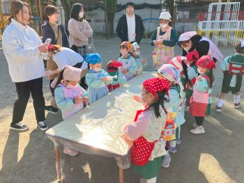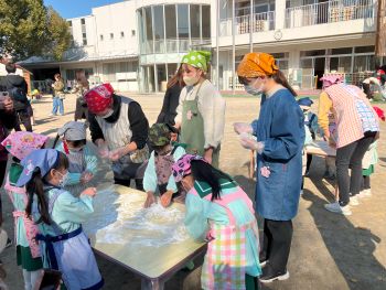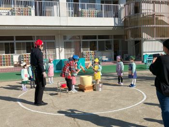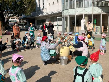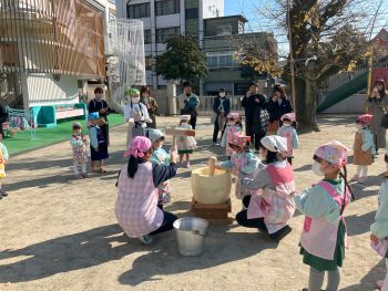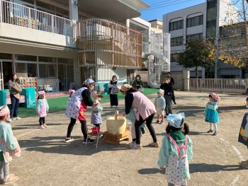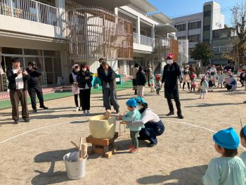 | 2025/12/16 もちつき 年長・年少々 園庭で年長と年少々のもちつきが行われました。 炊き立てのもち米から自分たちでもちをつく、日常ではなかなか経験できない活動ができました。 ついたもちを丸めながら、「もちもちだね」「あったかいね」と友達と話をしながら楽しんで活動に取り組む子ども達でした。 |