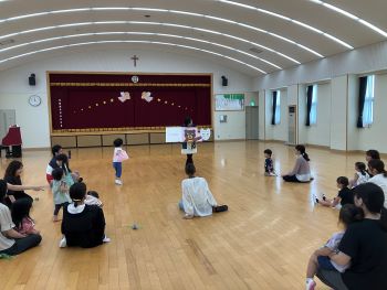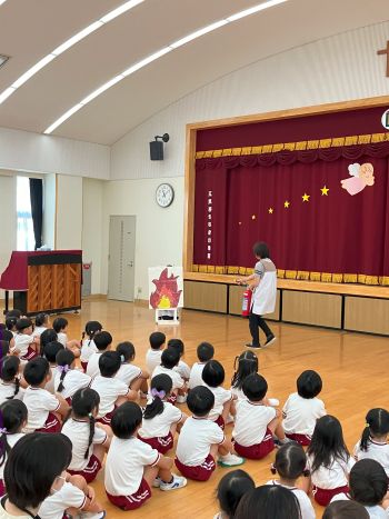 | 2025/09/26 9月誕生会 今日は、9月生まれの子ども達の誕生会がありました。名前や将来の夢について笑顔で元気いっぱいに発表する子どもたちでした。出し物では、年少々組、年中組の遊戯を保育者が発表し、子ども達も見ながら一緒に踊る姿がありました。大型絵本の出し物もあり、楽しそうに過ごす子ども達でした。 |