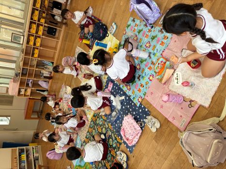 | 2025/09/17 年少々組 園外保育 今日は、園外保育でメルヘン館に出掛けました。おままごとでや木のおもちゃで遊んだり、大きな家にきのこや葉っぱをくっつけて遊んだり楽しく遊ぶ子ども達でした。また、シアターではみんなで絵本を作り、みんなで作った絵本の世界を楽しむ姿がありました。昼食は、リズム室で美味しくいただきました。 |