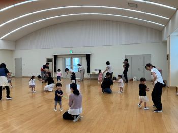 | 2025/10/02 のびのびクラブ 今日は親子で運動遊びをしました。絵本の「ペンギンたいそう」にあわせて体操をしたり、フープやボールを使ったりして遊びました。フープはトンネルにしてくぐり、ボールはおばけの的に当てたり、箱に投げ入れたりして遊びました。親子で体を動かし、楽しく遊ぶ子ども達でした。 |