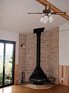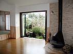 庭の池と一体となるようにリビングスペースに大きな開口をもうけました。また、室内には薪ストーブもあり、暖かみのある雰囲気となっています。