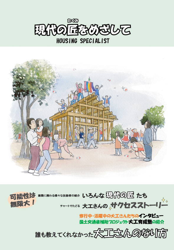 鹿児島県木造住宅推進協議会による、木造住宅の建設に携わる技能者育成のためのパンフレットと冊子です。パンフレットは主に県内の中学校に配布され、冊子は県内の高等技術専門校や工業高等学校の建築系の学生に配布しています。これらは職業進路指導のためのテキストとして活用されています。