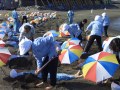 砂むし温泉のある摺ヶ浜。その後背地の山の手には,90℃を越す泉源がいくつもあり,この内陸部の熱水が海岸部に流下して自然湧水しているといわれる。鹿児島湾の海水も浸透するが,地下では,地下水と海水の境界(塩水クサビ)ができているとみられ,内陸からの熱水は,このクサビを通過せず,クサビに沿って湧き上がってくる。