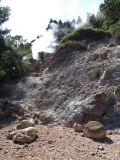 池田湖の北東2km,標高約200mの山中にある噴気変質帯。熱水と火山ガスの作用によって,安山岩や安山岩質の凝灰岩が粘土化しカオリンに変化している。熱を帯びた地面,白い噴気は,今なお,指宿の火山が生きていることを実感させる。