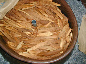 良く干した大根に海水を塗しながら、杵で搗いて肉質を均一にし、底にスノコを敷いた大きなカメ壺に塩漬けし、6ケ月以上発酵熟成させると、独特の風味を持つ「山川漬」が出来上がります。山川地方は冬場でも霜が降りない温かい気候であるため、大根の干燥に適していたと思われます。
