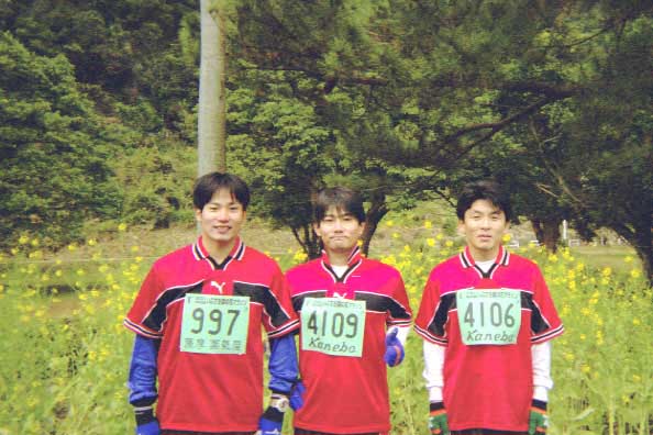 スタート直前!菜の花マラソンなので菜の花の前で記念写真。Nobu&Kenちゃん&Komaちゃん