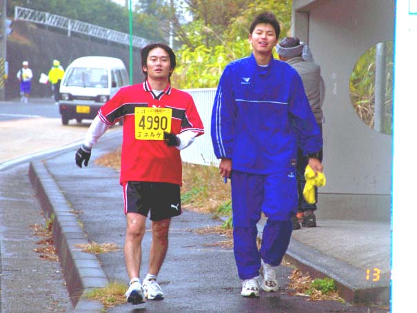 この2人にもうどんを食わせる。だって寒そうなんだもん。あとはゴールで待ってます。がんばってね〜