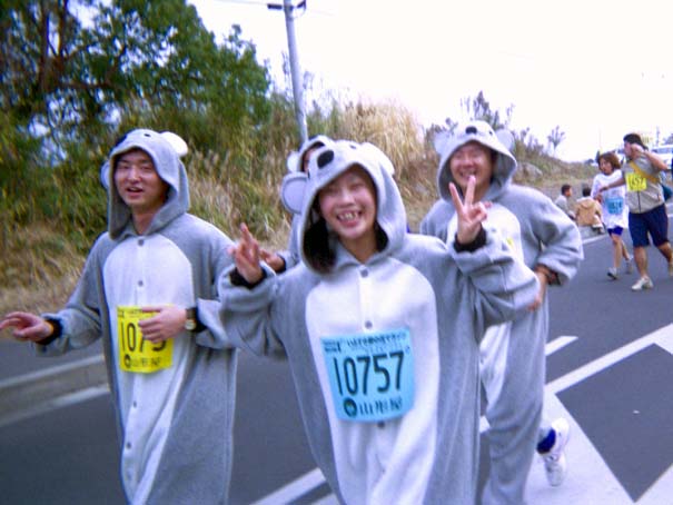 まったく知らない人たち。男3人女1人のコアラの人々。見ていると楽しい。こんな格好で走る体力は多分ないな〜