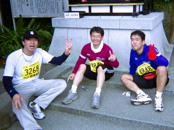 らしかったのに、何故か最後尾の私のところへ、枚聞神社で休憩です。先発の2人の兄さんのここで休憩中でした。