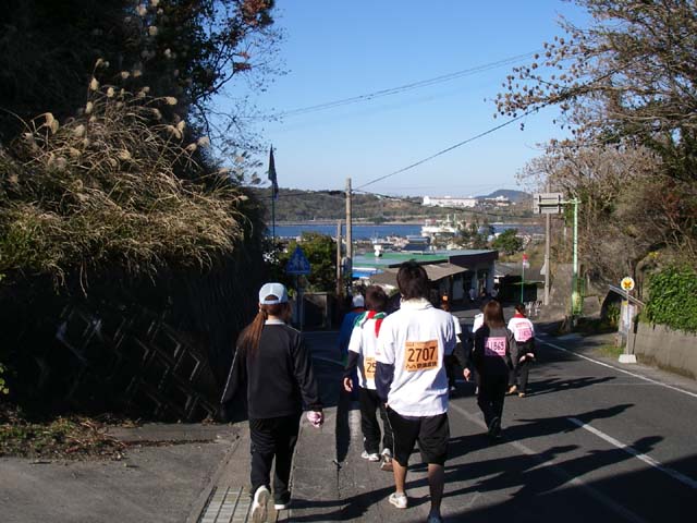 山川港に下りていく道。海の向こうに見える白い建物の下まで行きます。