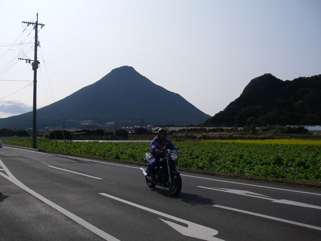 目の前の開聞岳に向かって歩く!いいなバイクは〜気持ちよさそうだな〜