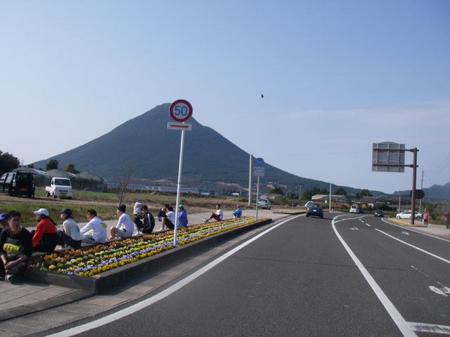 フラワーパークを右に、開聞岳を左に見ながら歩く!!休憩している人も増えてきました!