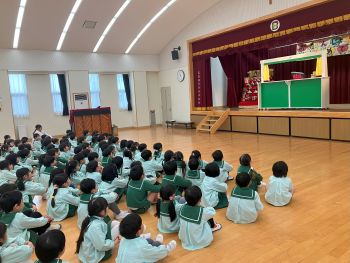 | 2026/02/06 2月誕生会 今日は、2月生まれの子ども達の誕生会がありました。緊張する姿もありましたが、舞台の上で堂々と将来の夢を発表する子ども達でした。先生たちからの出し物の大型紙芝居や人形劇「3匹のこぶた」を見て楽しむ姿がありました。 |