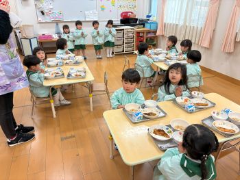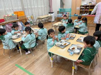 | 2026/02/04 年少組・年少々組 給食交流 今日は年少組と年少々組で給食交流を行いました。ほし組、つき組の部屋で一緒に当番活動をしたり給食を食べたりしました。緊張しながらも楽しく食べる子ども達でした。 |