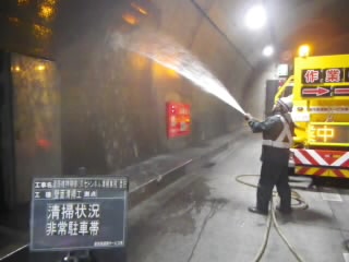 ガードレール清掃車により、回転ブラシをあててガードレールの汚れやコケ等を落としてきれいにします。