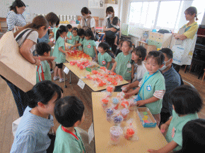 | 2025/09/24 ☆ お店やさんごっこ ☆ 自分で作った品物やお目当ての品物を買ったり、 みんなで協力して品物を売ったりして お店やさんごっこを楽しむことができました。 |