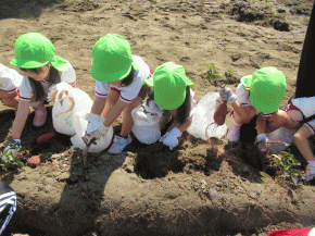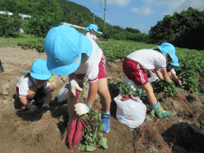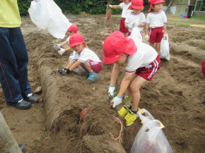 | 2025/10 ☆ 園外保育(いも掘り) ☆ 先生やおうちの方たちに手伝ってもらいながら、大きな おいもをたくさん掘ることができました。つるについている いもの様子を観察したり、友達といもの大きさや形を比べ たりしながら楽しくいも掘りができました。 |
